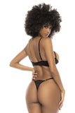 A playful babydoll with lace and sheer mesh contrasts. Includes underwire, adjustable straps, back-tie opening, ruffle trims and matching thong with heart...