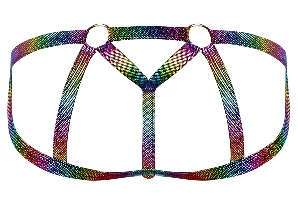 Embrace bold style with this unique rainbow strappy jock brief, designed for those who love to make a statement. The vibrant, shimmering rainbow fabric adds a festive touch, while the open-back design with multiple straps creates an alluring, provocative look. Featuring metal rings on the back straps, this jock brief offers a striking and edgy design that enhances your physique. The soft, stretchy fabric provides a comfortable fit, and the contoured front pouch offers support and a flattering shape. Perfect for special occasions or for adding excitement to your intimate collection.