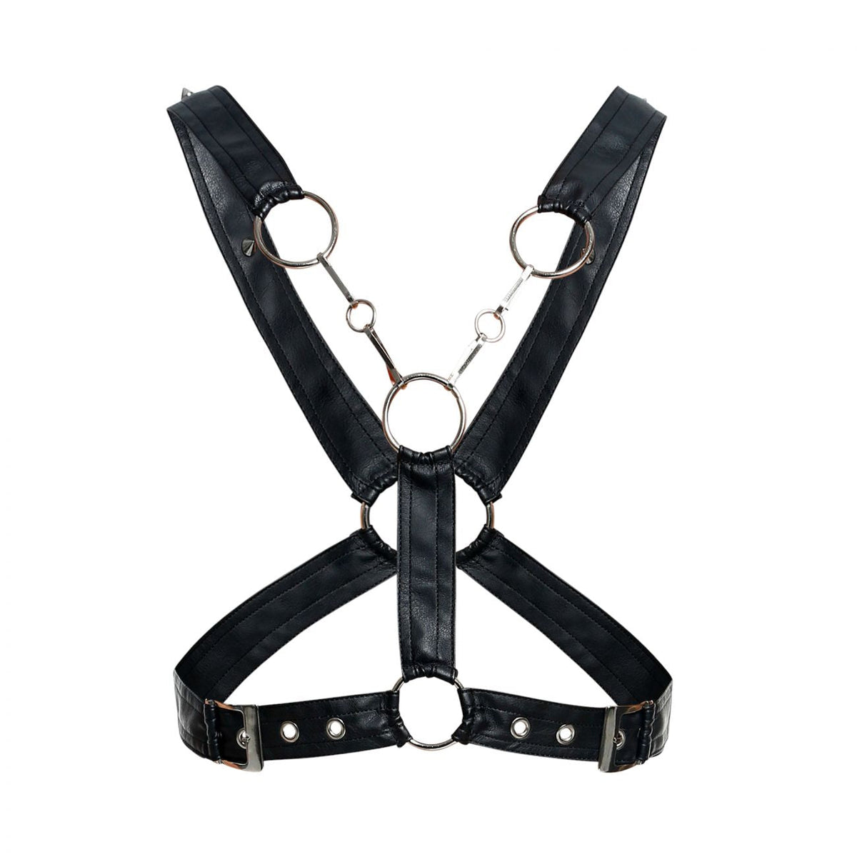 Wide straps on harness on an imitation leather fabric. Completely open back and front. Metallic accents. Please refer to size chart to...