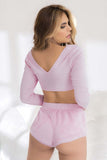 The soft touch of this "velour look" fabric will lure you into a warm sensation of comfort and relaxation. Long-sleeved crop top and matching shorts with elastic waist.