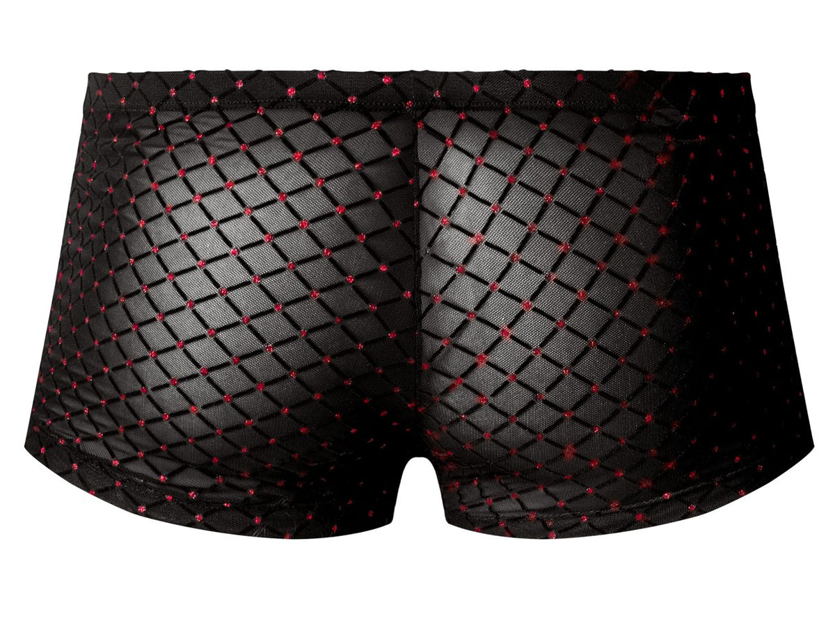Turn up the allure with these sheer mesh boxer briefs, featuring a striking diamond pattern for a bold and sensual look. The lightweight, see-through black mesh fabric provides a comfortable, barely-there feel, perfect for special occasions or adding a daring touch to your wardrobe. The subtle diamond design and snug fit enhance the body’s natural contours, while the soft, stretchy material ensures comfort and flexibility. Ideal for men who appreciate unique, provocative style with a modern edge.