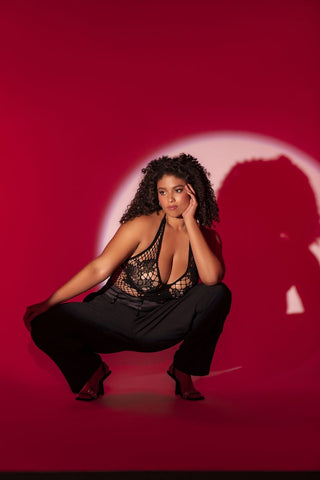 A versatile fishnet bodysuit that can be styled with either a halter or crossed neckline. It features front floral details and an...