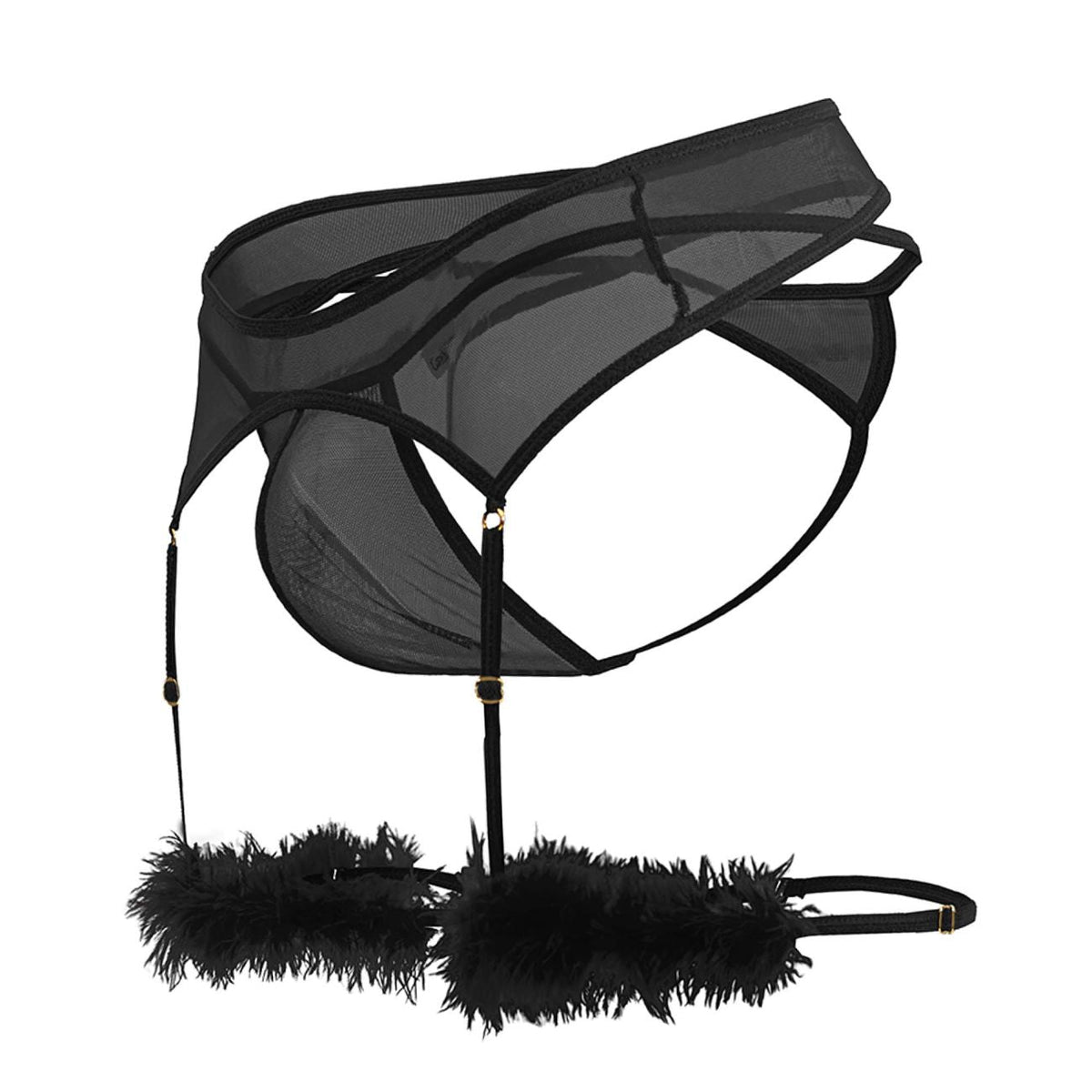 Dare to go bold! This ultra-revealing black thong with gold chain garter details is designed for those who own their confidence. With...