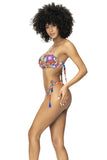 Support, style and comfort all in this 2 piece swimsuit with an adjustable underwire top and side tie medium coverage bottom. In a crochet print with tassel details.