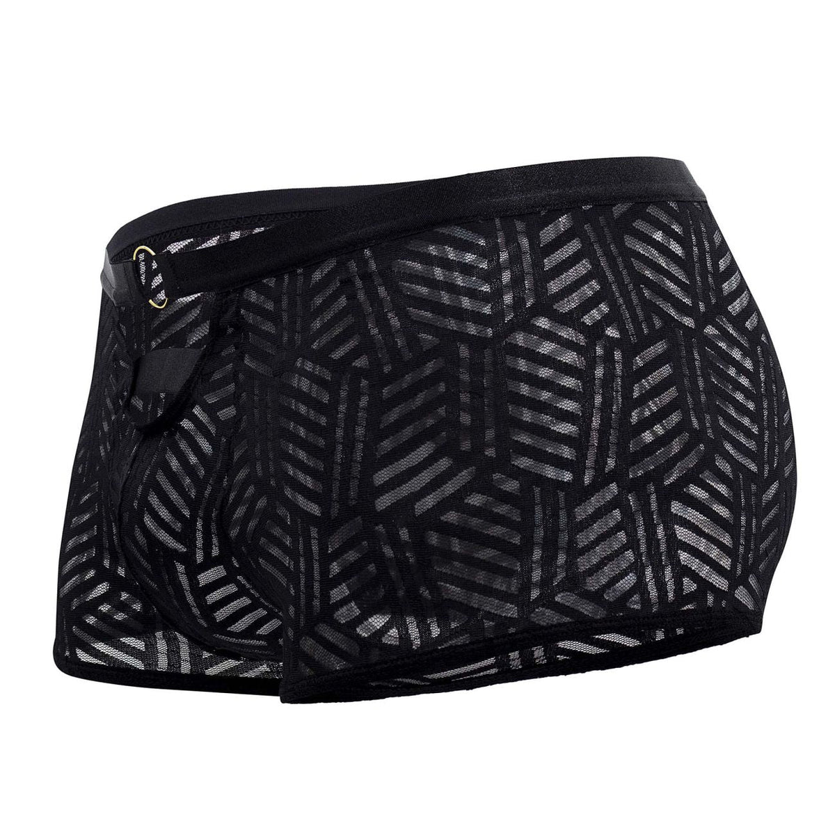From the Rude Awakening collection by Male Power, the Cheeky Cutout Short  features very high cut legs with a cutout window above the pouch. Color coordinating  satin straps and gold ringed waistband. Sheer stretch mesh with an eclectic cutout pattern throughout. Plush satin finished waistband and straps.