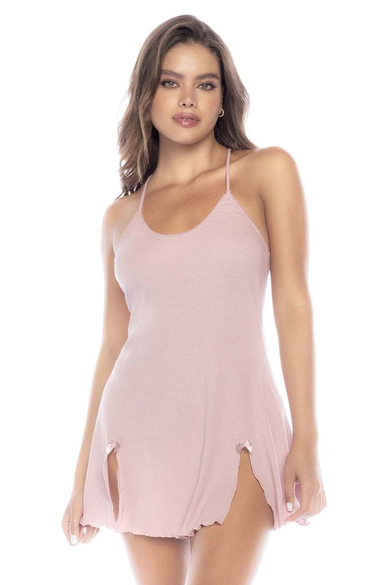 A timeless sleep chemise in a soft ribbed fabric. Features adjustable straps, side slits with satin bow details and semi-loose silhouette.