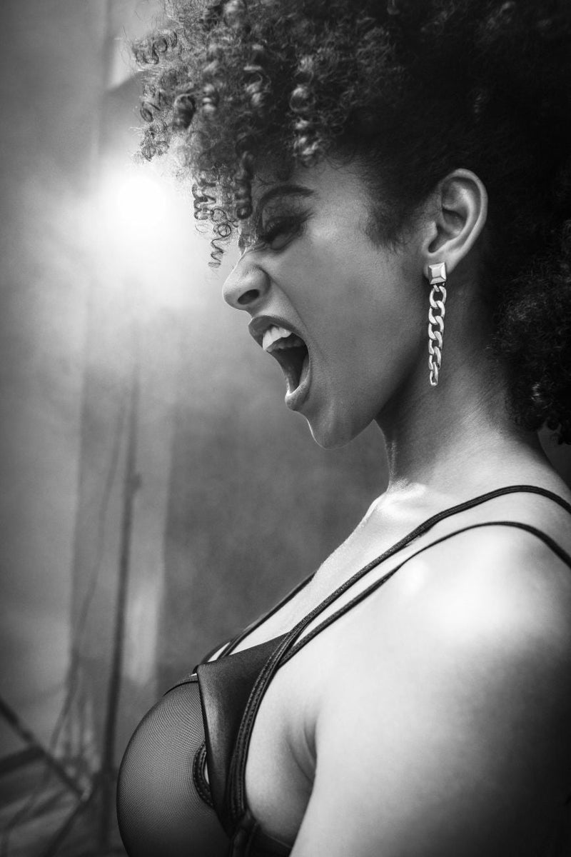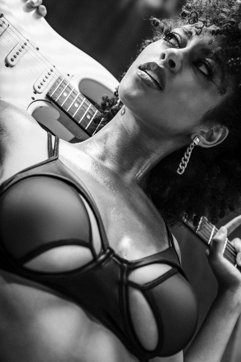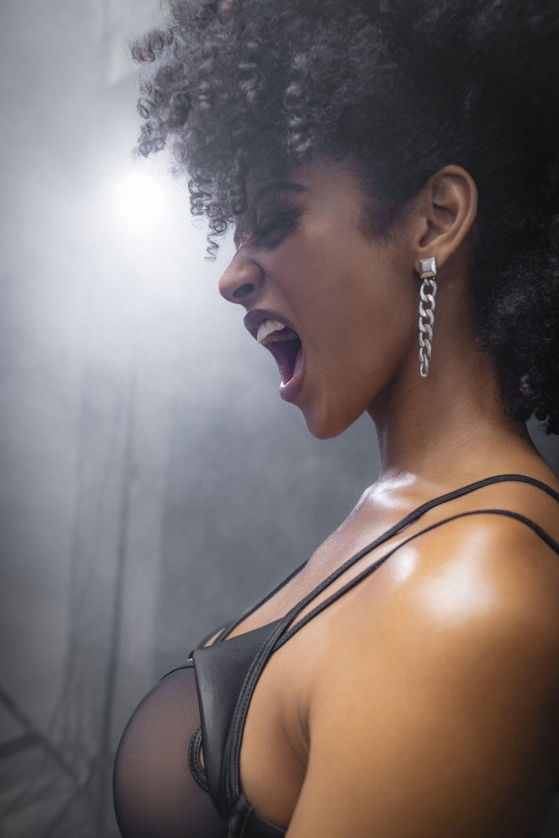 Two-piece set in sheer mesh and wet look fabric.  Includes top with semi-open cup design and double adjustable straps and matching thong.