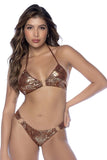 Your sun-kissed skin will shine in this gold snake print two-piece, featuring an adjustable top and a matching thong with ring details.