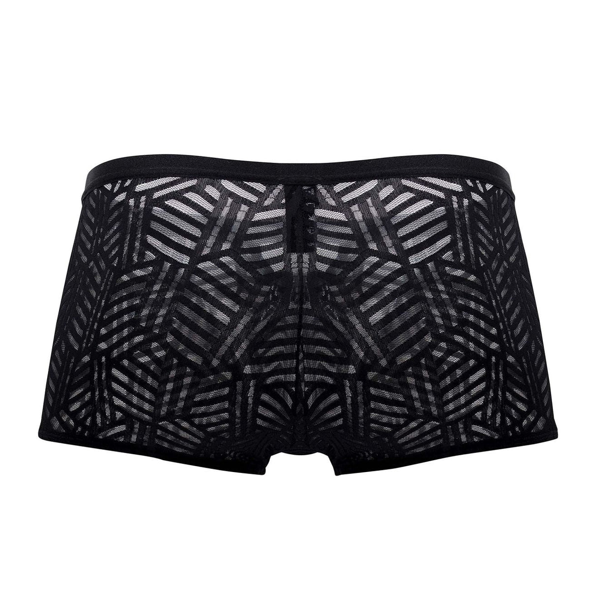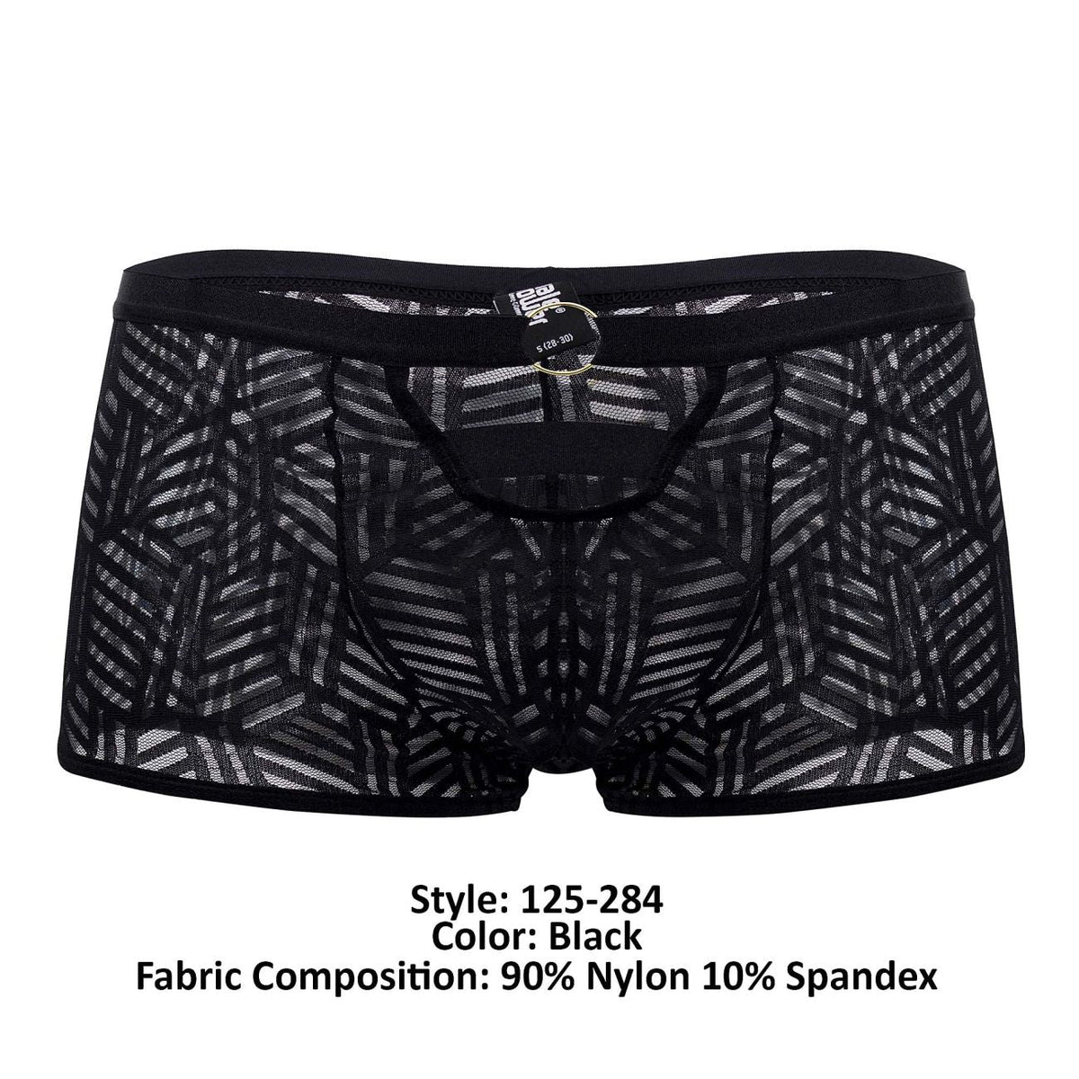 From the Rude Awakening collection by Male Power, the Cheeky Cutout Short  features very high cut legs with a cutout window above the pouch. Color coordinating  satin straps and gold ringed waistband. Sheer stretch mesh with an eclectic cutout pattern throughout. Plush satin finished waistband and straps.