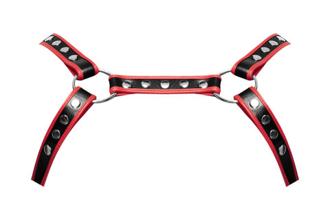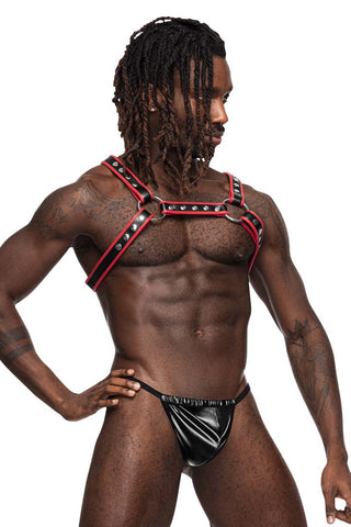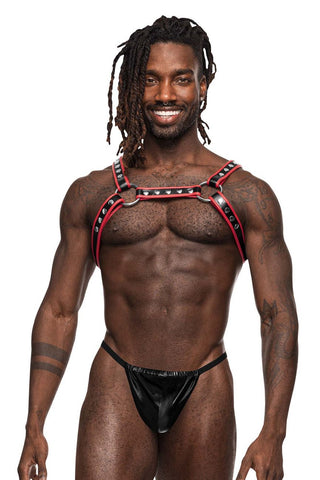 From the Leather collection by Male Power, this style includes: A harness featuring adjustable metal buckles, attached rings, and decorative metal studding....